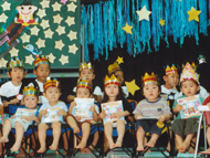- めばえ組(0才児) ふたば組(1才児) わかば組(2才児) あおば組(3才児) つぼみ組(4才児) は な組(5才児)